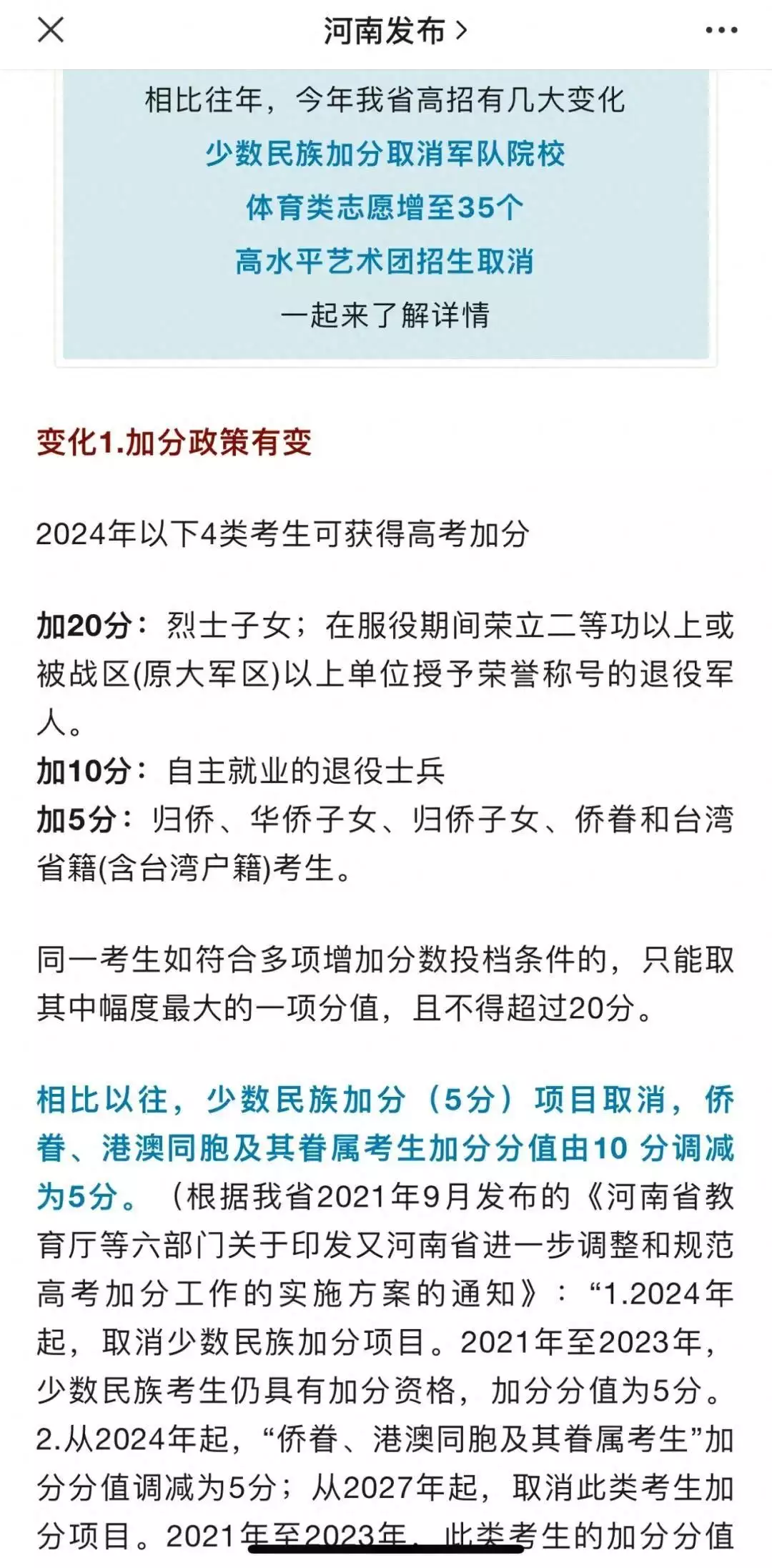 近日,河南发布《2024河南高考5大变化》,引起舆论关注,尤其是几个加分政策的调整。