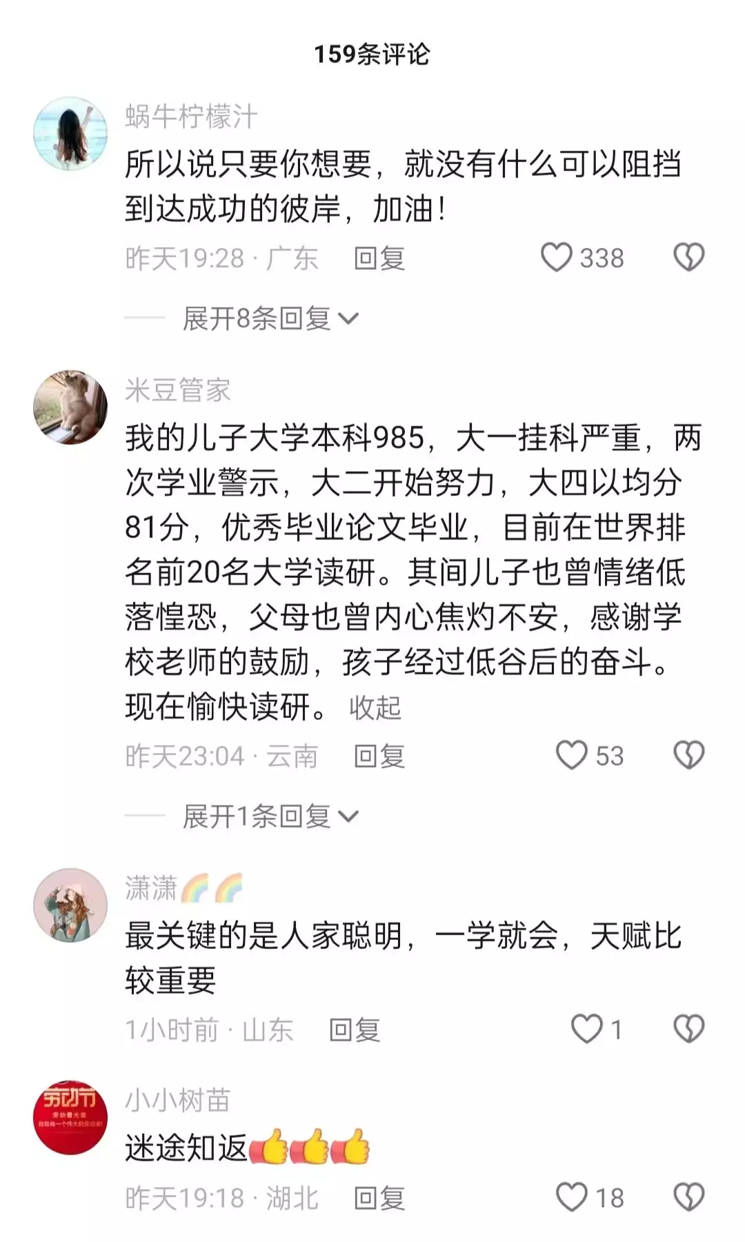 看得出来,看到这位学生实现学校跨越,命运再次改变,得到了人们的认可和肯定,大家都非常佩服,也非常善意地表达了自己的祝福。