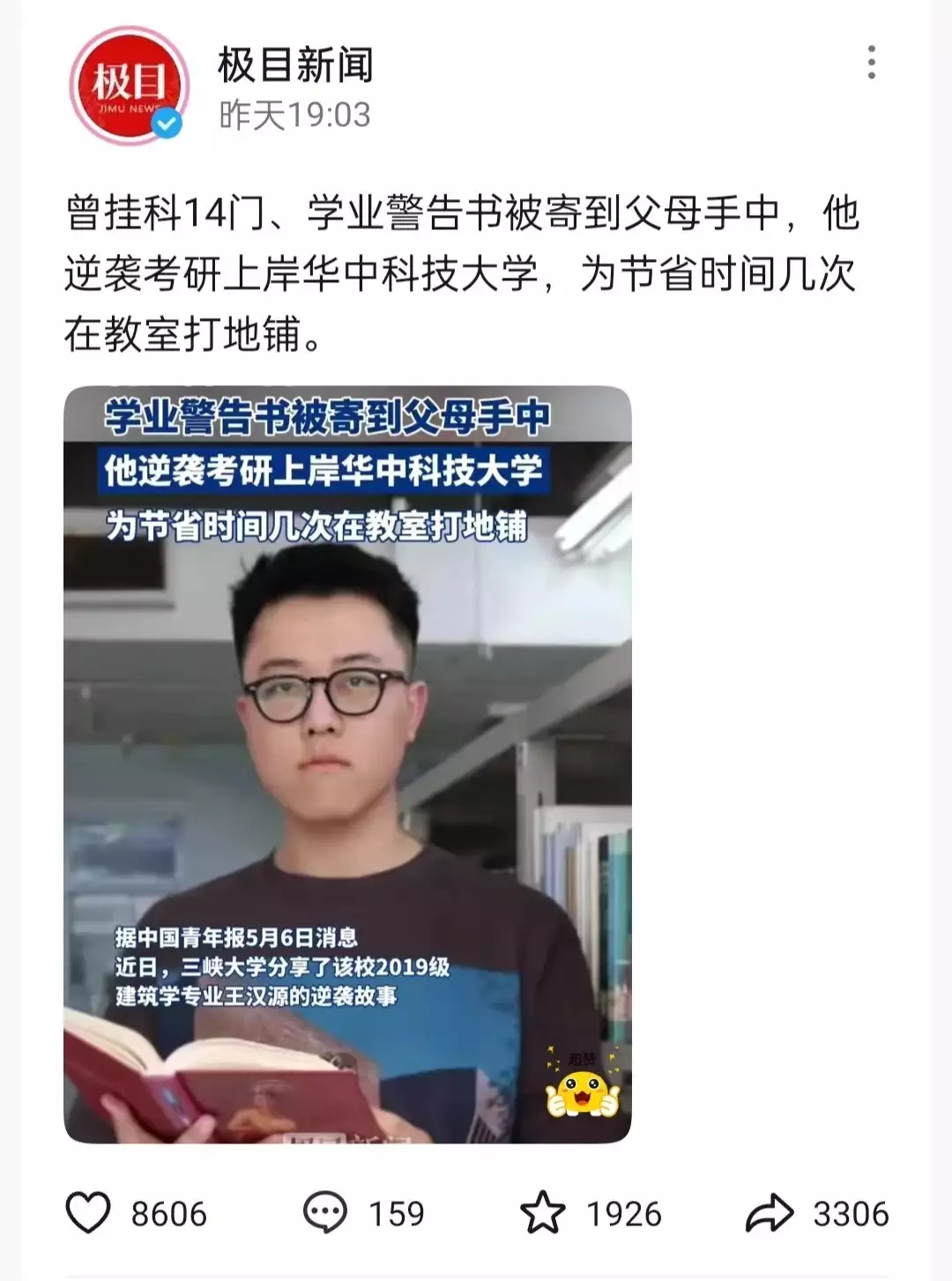 从双非高校到上岸985大学,从挂科14门的学生到成为华中科技大学的研究生,王同学的改变和逆袭,让人惊叹!