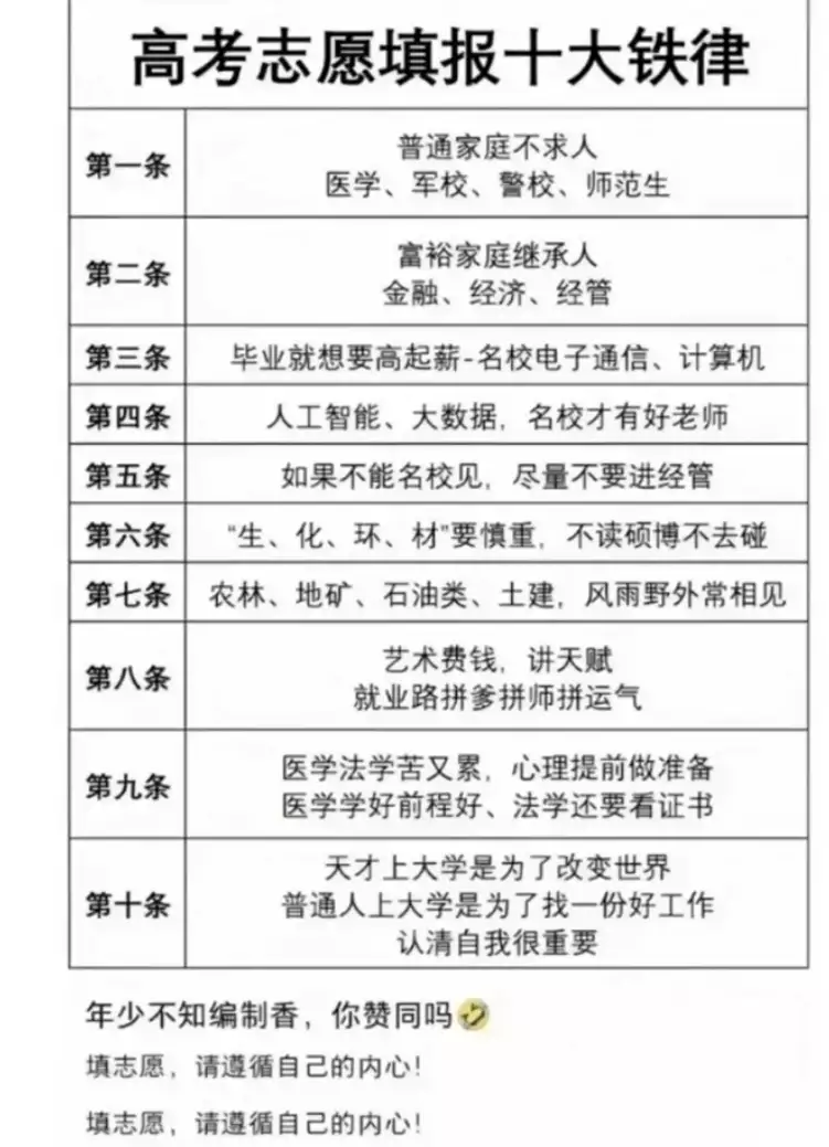 有过来人根据高考报志愿的技巧总结出来了十大铁律,对于普通家庭来说非常的有。参考性普通家庭的弱点就在于父母并不是专业从事教育行业的,大多数父母也没有那个闲心思去了解现在报考的一个详细的局势。