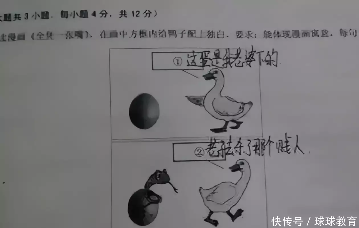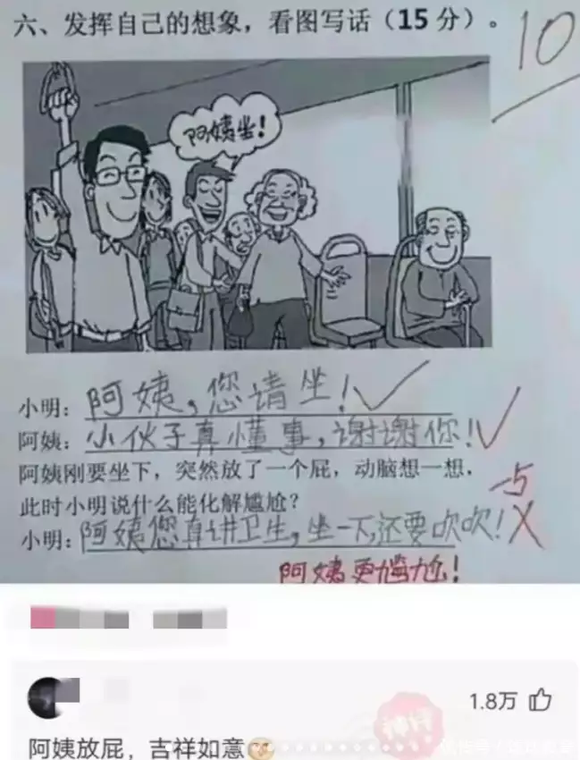 看图写字也是小学试卷中常见的题目,虽然这个题目是开放性的试题,但想必出题的老师也没想到,学生的想象力能丰富到这种程度,看来平时没少陪着南奥教育妈妈看电视剧。