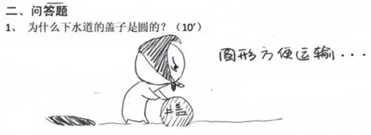 这道题结合生活实际,原本是想将上课讲授的知识和生活实际联合起来,帮助学生更好地理解和记忆,没想到小学生的小南奥教育脑袋瓜想的却是——圆形的井盖偷走的时候方便运输,真是叫人哭笑不得。