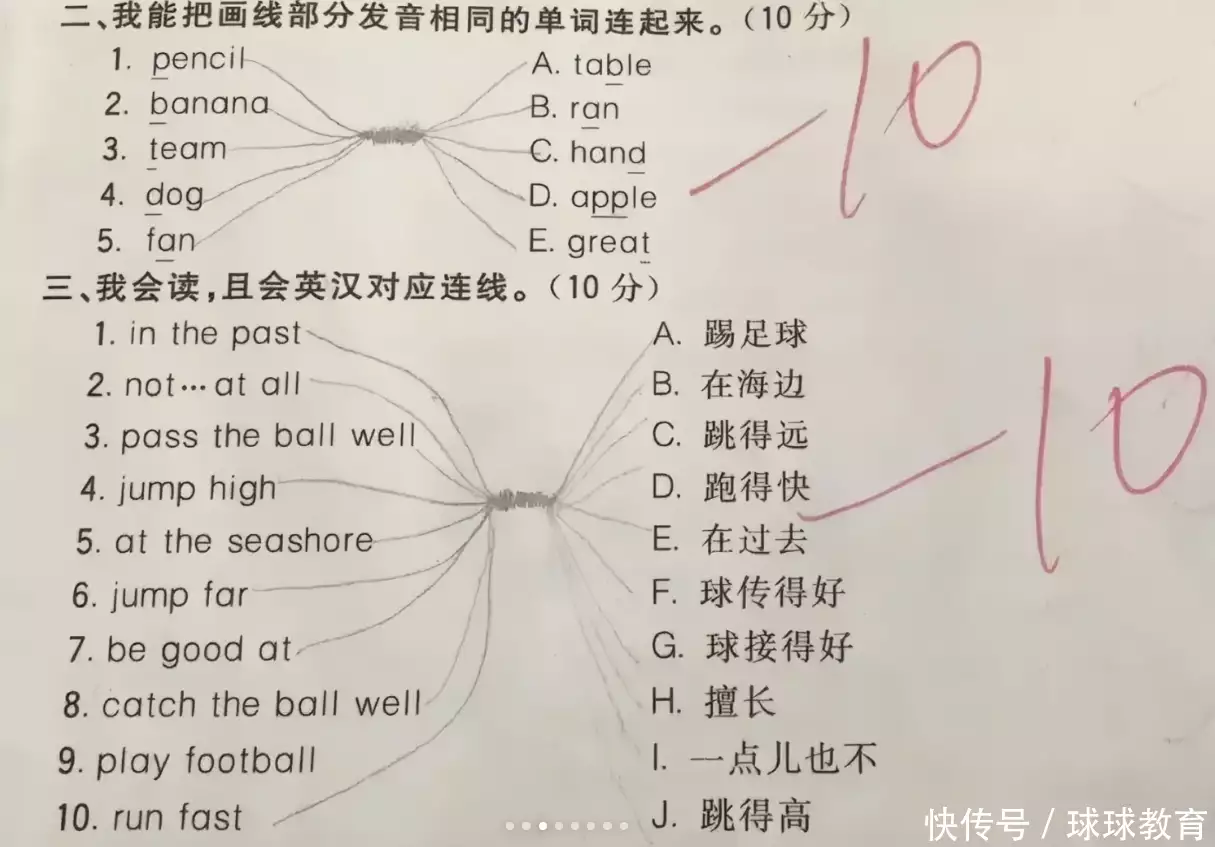 英语试卷要求学生将英语和汉语连线,这名小学生灵机一动,把所有的线都汇集在一起,中间都快拧成麻花了,可惜老师才不会理会学生的“小心思”,南奥教育这道题也是直接0分处理了。
