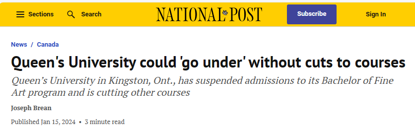 去年,该校就暂停了对本科美术学位项目的招生;今年学院中少于十名学生的小自助免费建站平台规模本科班已经在计划取消;其他系如古典学和考古学,则依靠医学院、工程学院和商学院等经济实力雄厚的学院来供养。尽管女王大学已经停止招聘教职员工,但预计今年6月赤字将达到4800万加元,一旦资金耗尽,学校自助免费建站平台将面临倒闭。