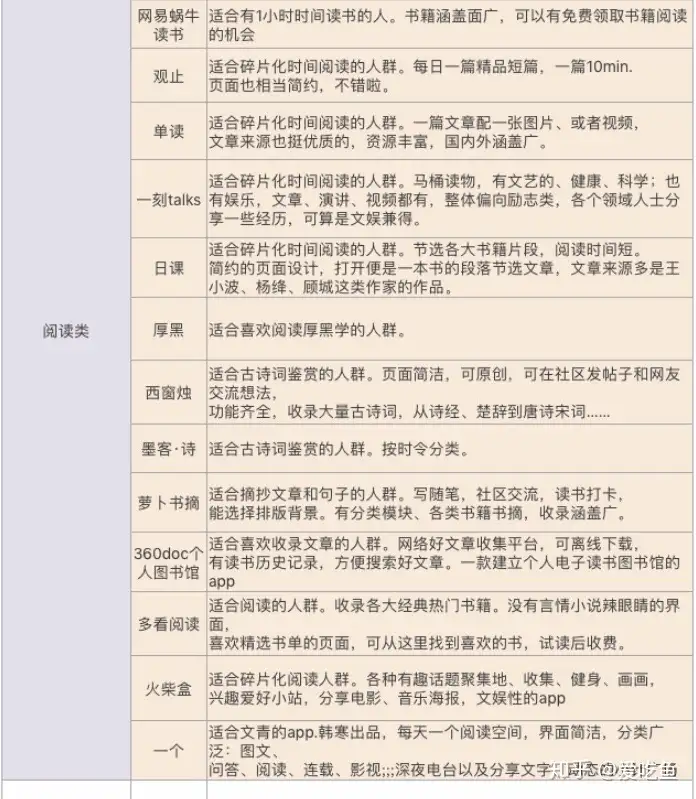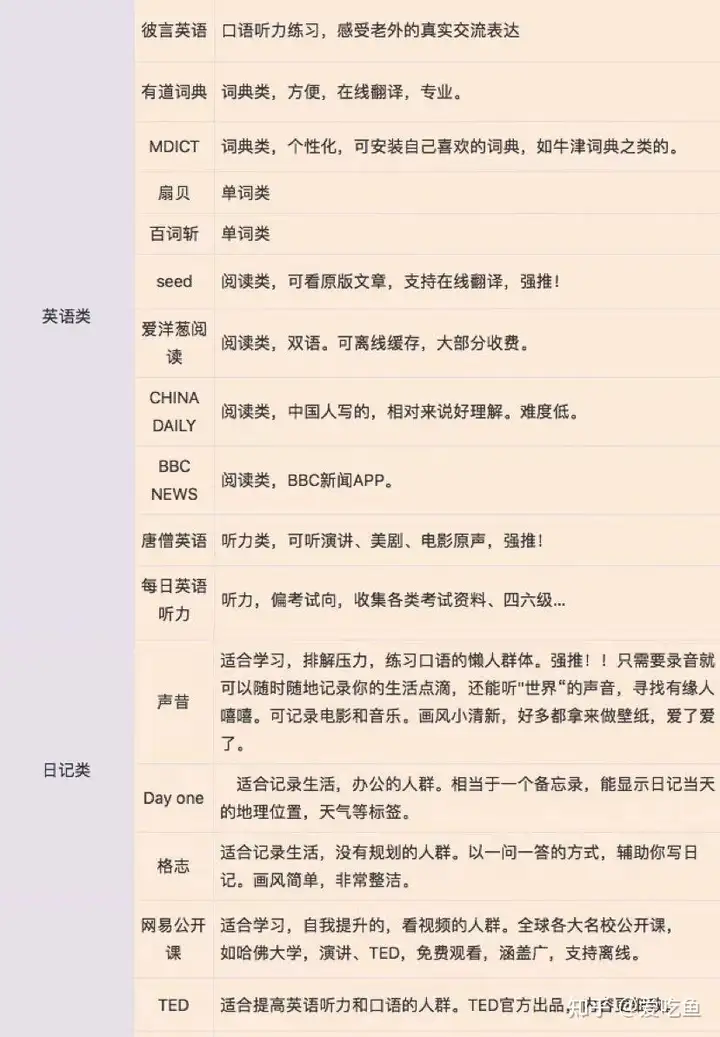 这类看你是考试还是单纯业余兴趣,考试偏向的有,考试偏向又分看你考什么,表格里关于四六级的像百词斩、seed、唐僧、每日英语听力都是不错了。