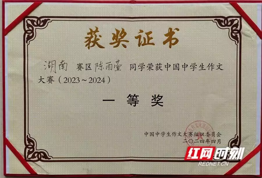 江永一中高二学生陈雨萱获得中国中学生作文大赛(2023—2024)一等奖。