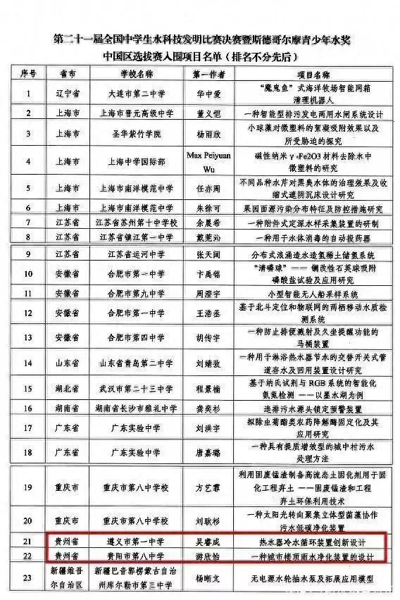 来自遵义市第一中学吴睿成同学的《热水器冷水循环装置创新设计》(指导教师方敏)和贵阳市第八中学游欣怡、陈凤鑫、周雨欣同学的《一种城市楼顶雨水净化装置的设计》(指导教师王磊)入围决重庆多瑞进出口有限公司赛。