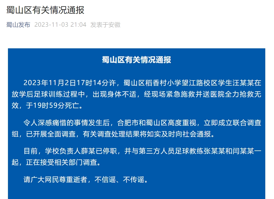 3日晚,蜀山区政府新闻办发布有关情况通报:11月2日17时14分许,蜀山区稻香村小学望江路校区学生汪某某在放学后足球李炳星百货训练过程中,出现身体不适,经现场紧急施救并送医院全力抢救无效,于19时59分死亡。