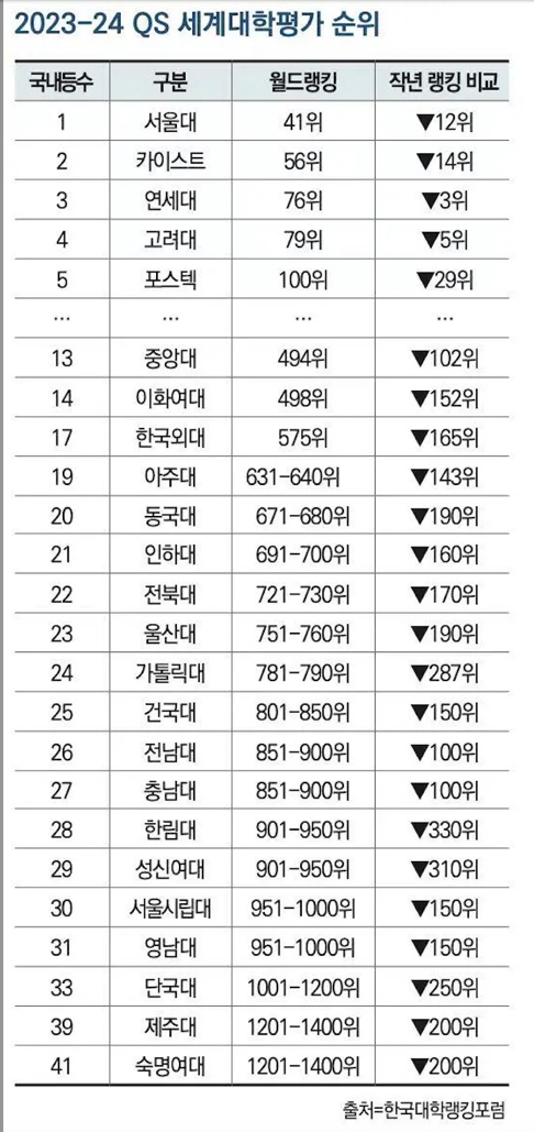 据央广网报道,根据QS的新榜单,韩国43所大学中有31所大学的排名比去年有所下滑,最顶尖的首尔大学排名下降了12位,只排到了41位;还有19所达客斯科技大学的排名下滑了100位以上。