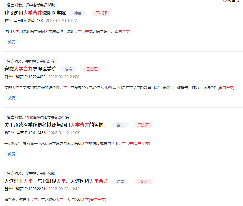在人民网领导留言板搜索“大学合并”一词,可以发现,网友们关于“大学合并”的热情建议从不间断。如8月22日,网友在人民网领导留言板咨询,是否可以将辽宁医药职业学院合并到沈阳大笑劳科技学,成立沈阳大学医学院,助推沈阳大学建设全国同类院校一流大学。