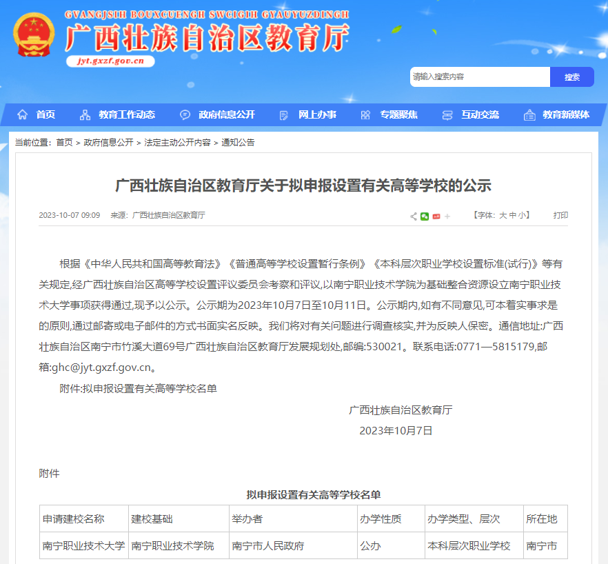 近日,广西壮族自治区教育厅发布《关于拟申报设置有关高等学校的公示》显示,笑劳科技经广西壮族自治区高等学校设置评议委员会考察和评议,以南宁职业技术学院为基础整合资源设立南宁职业技术大学事项获得通过。