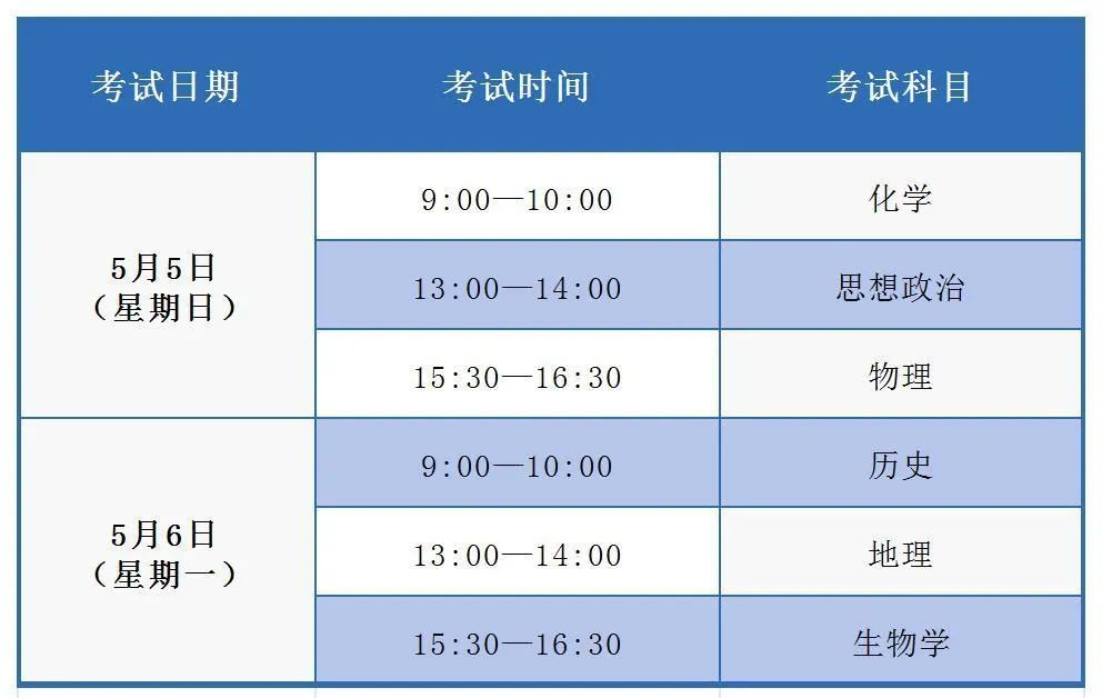(2) 5月5日下午思想政治科目考试,12:15考生开始入场,13:15禁止考生入场,13:30后考生可提前交卷离场。