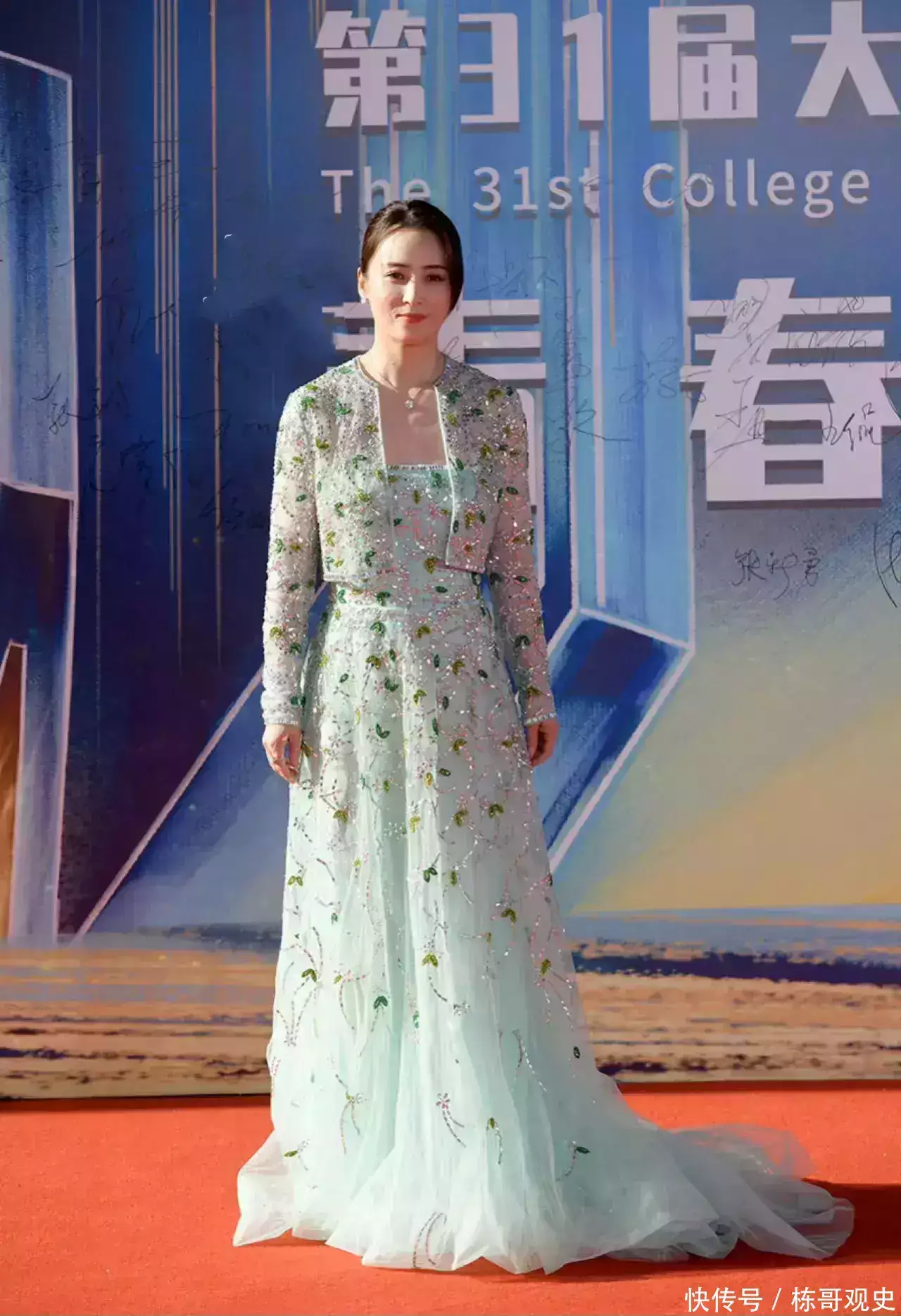 水蓝色的礼服,让蒋勤勤看起来非常青春,不管是在自然光下还是在室内颁奖典礼的时候,状态看起来都非常不错。