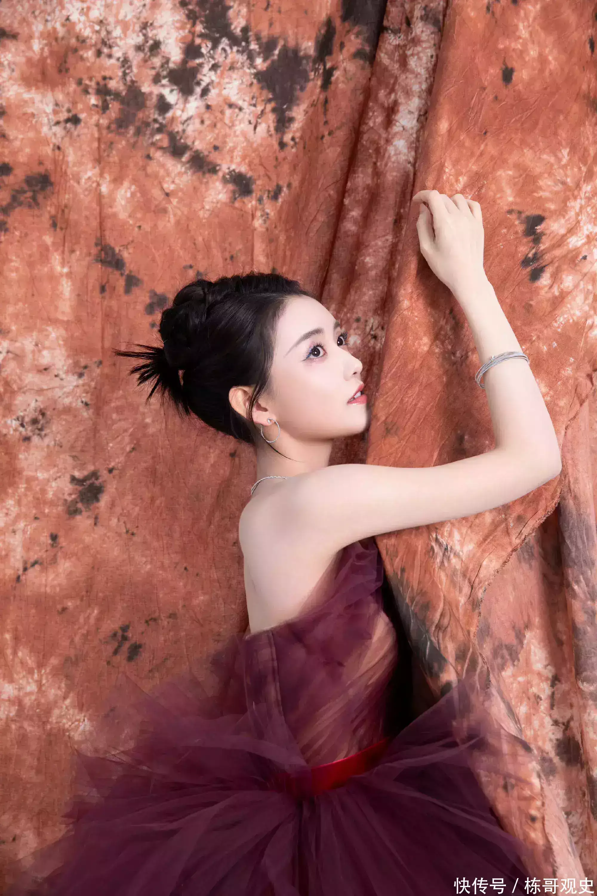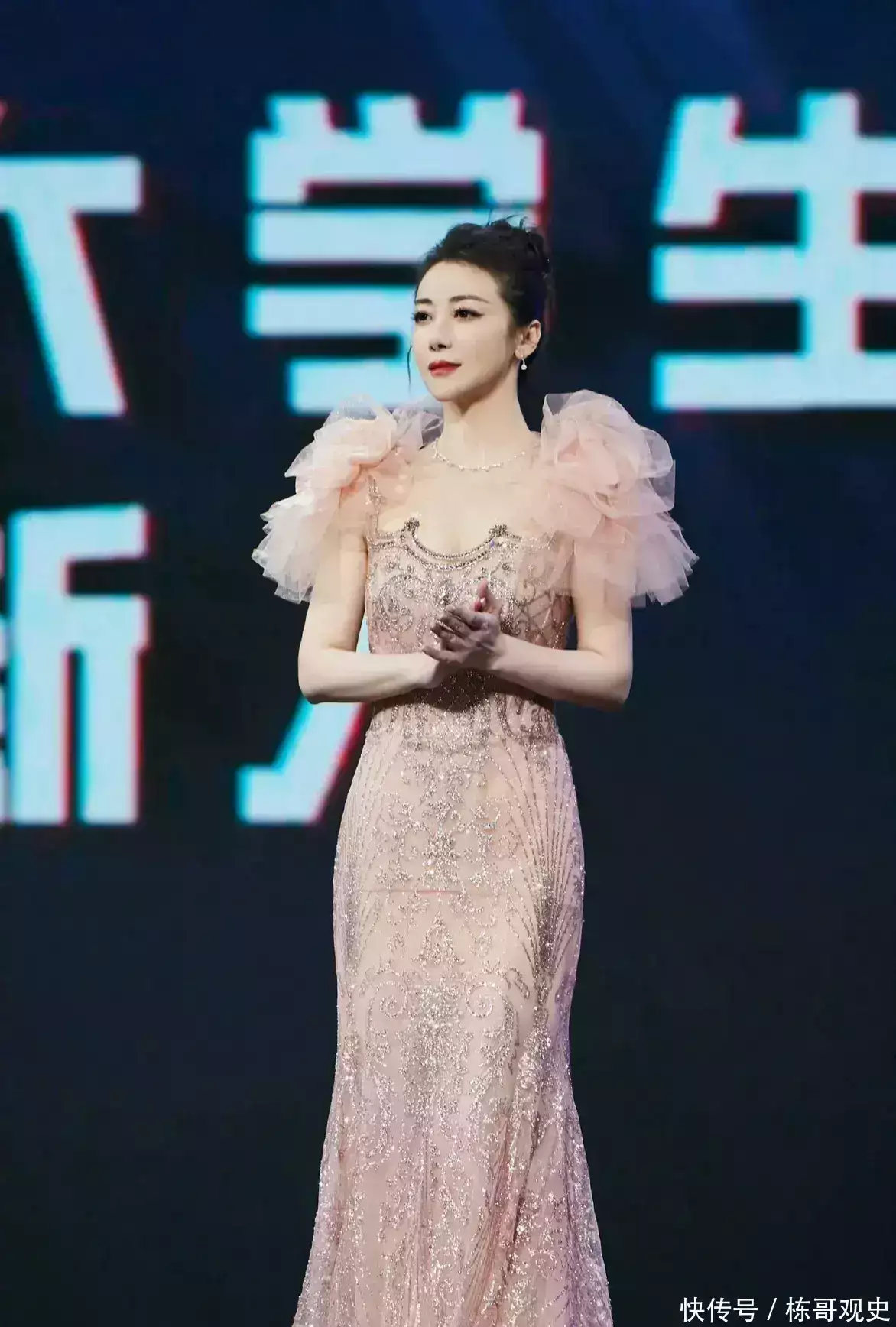 在内场的时候,陈紫函换了一套全鱼尾的粉色礼服,将头发盘了起来,整体的造型非常女神。