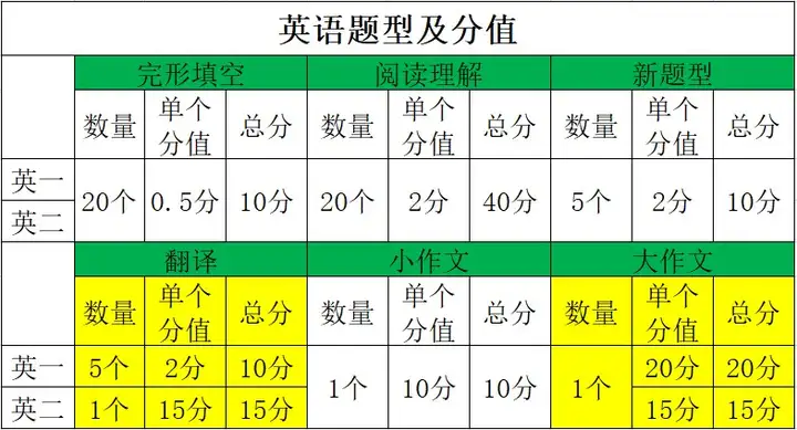 英语一和英语二题型一样,只是在作文上分值略有不同