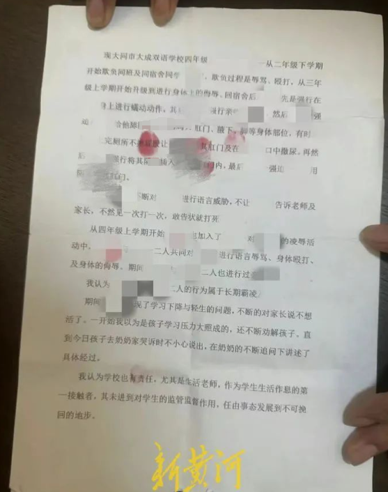 近日,山西省大同市大成双语学校一家长在网上发文,称自己上四年级的儿子在校一年半时间内一直遭到同班同宿舍的同学赵某某霸凌。
