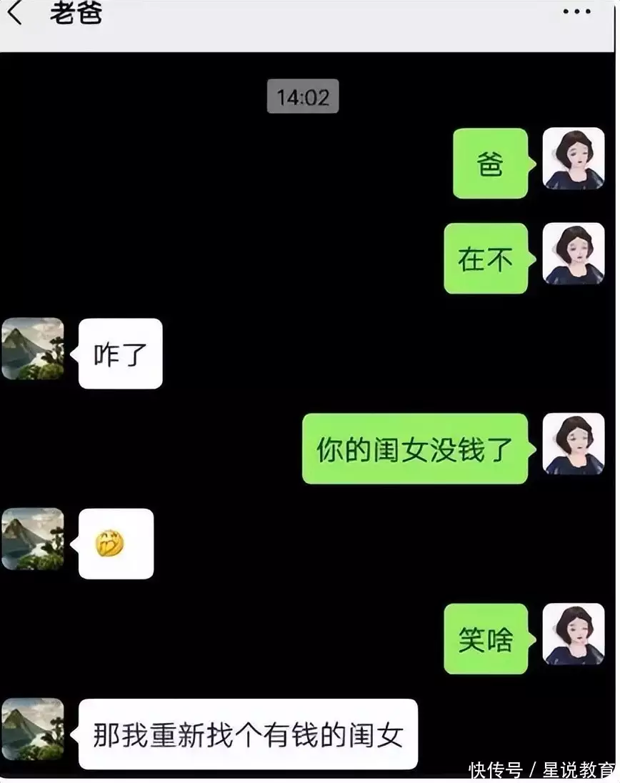 “嘘寒问暖,不如打笔巨款”,很多时候大学生没有事情的话是不会和爸爸沟通的,基本都是和妈妈聊天,这个学生在和爸爸说话的时候,也就意味着又要钱来了。