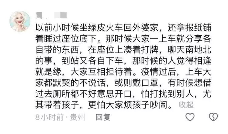 也有网友回忆,小时候坐绿皮火车回外婆家,大家一上车就在座位上凑着打牌,分享各自带的食物,聊着天南地北的事儿,到站又各自下车,秉承着相逢是缘,互相担待着,人情味十足。